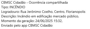 Na tarde desta terça-feira (24/6), por volta das 15h30, o Corpo de Bombeiros Militar de Santa Catarina (CBMSC) foi acionado, via 193, para atender a uma ocorrência de incêndio no Mercado Público, localizado no Centro de Florianópolis.