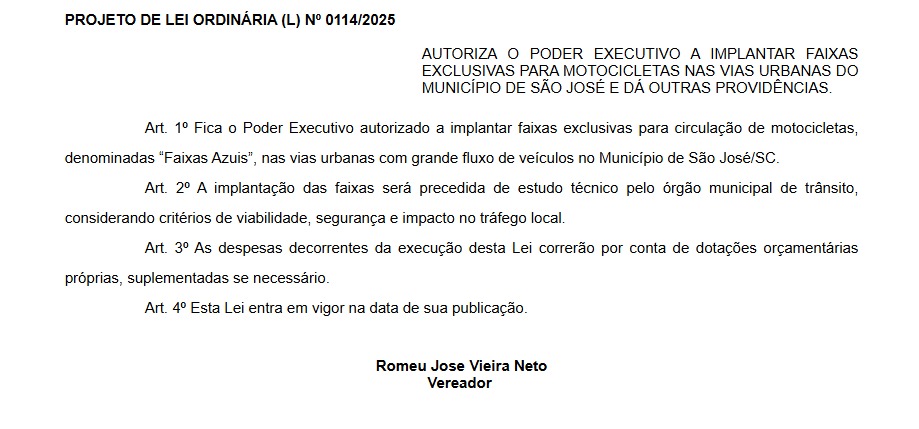 De autoria do vereador Romeu Vieira (PSD), a Lei nº 0114/2025, prevê a implantação da “Faixa Azul” exclusiva para motociclistas nas vias de maior fluxo do municío de São José.